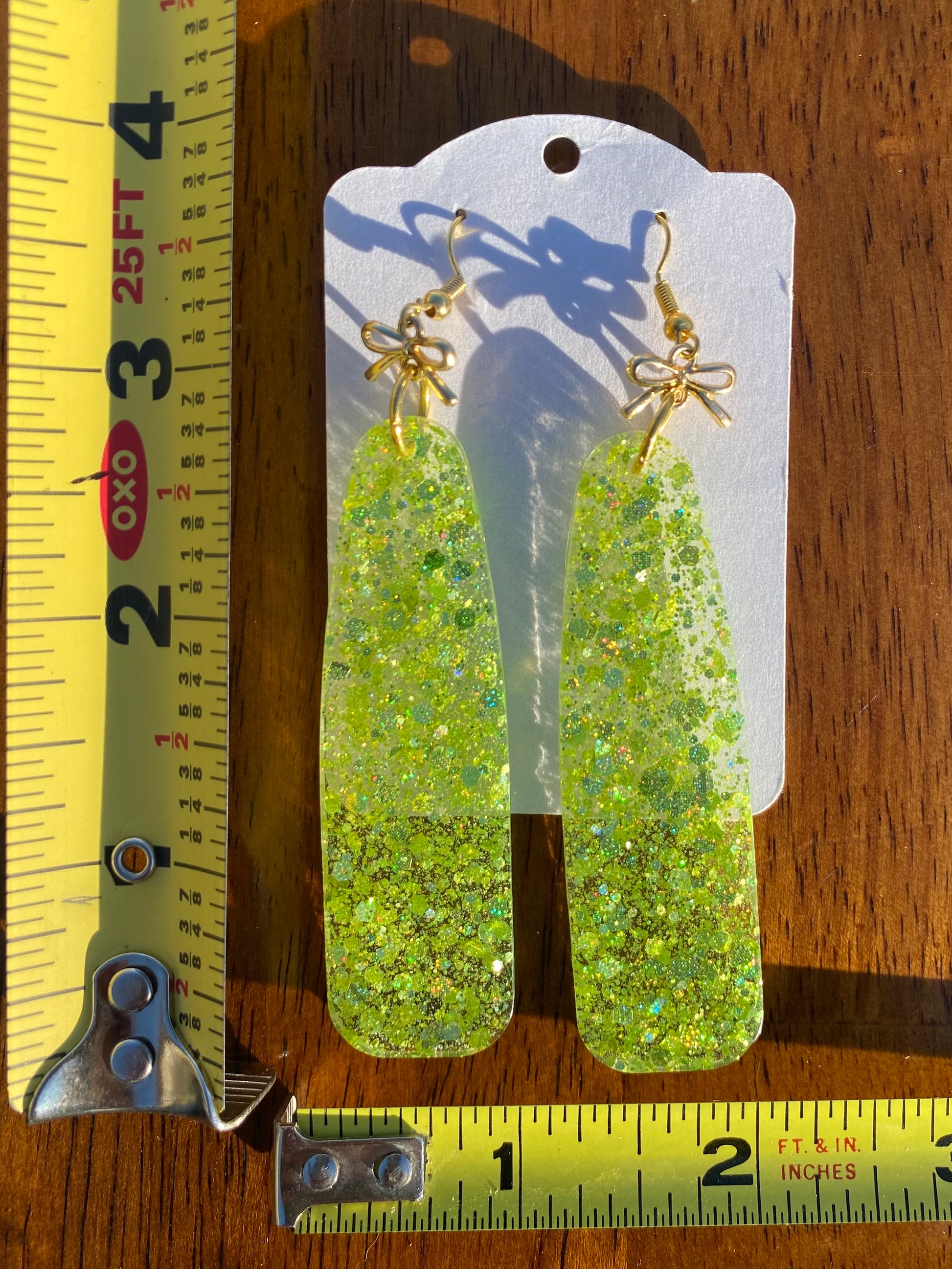 Add some fun to your look with these glittering green dangle earrings with bows! They have hypoallergenic fishhooks, making them comfy for all-day wear. Perfect for adding a touch of sparkle to any outfit!